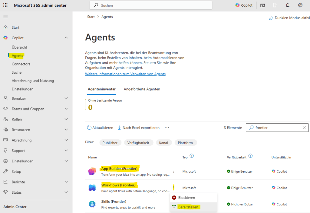 Da beide Agents auf Microsoft Copilot basieren, braucht man zwingend eine aktive Copilot-Lizenz, um sie überhaupt nutzen zu können. Nach Zuweisung solch einer Lizenz müssen die beiden Agents nun via Microsoft Admin Center an die gewünschten User ausgerollt werden.