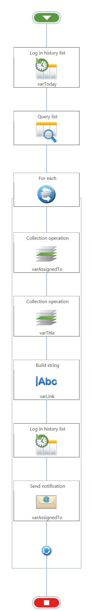 Mittels eines Site-Workflows, der z.B. immer morgens um 5 Uhr laufen kann, werden alle Elemente einer Aufgabenliste geprüft. Sind diese nicht im Status «Abgeschlossen» und ist das Erinnerungsdatum kleiner oder gleich dem heutigen Datum, wird die ID, der Aufgabentitel sowie die Person, der die Aufgabe zugewiesen ist, ausgelesen.