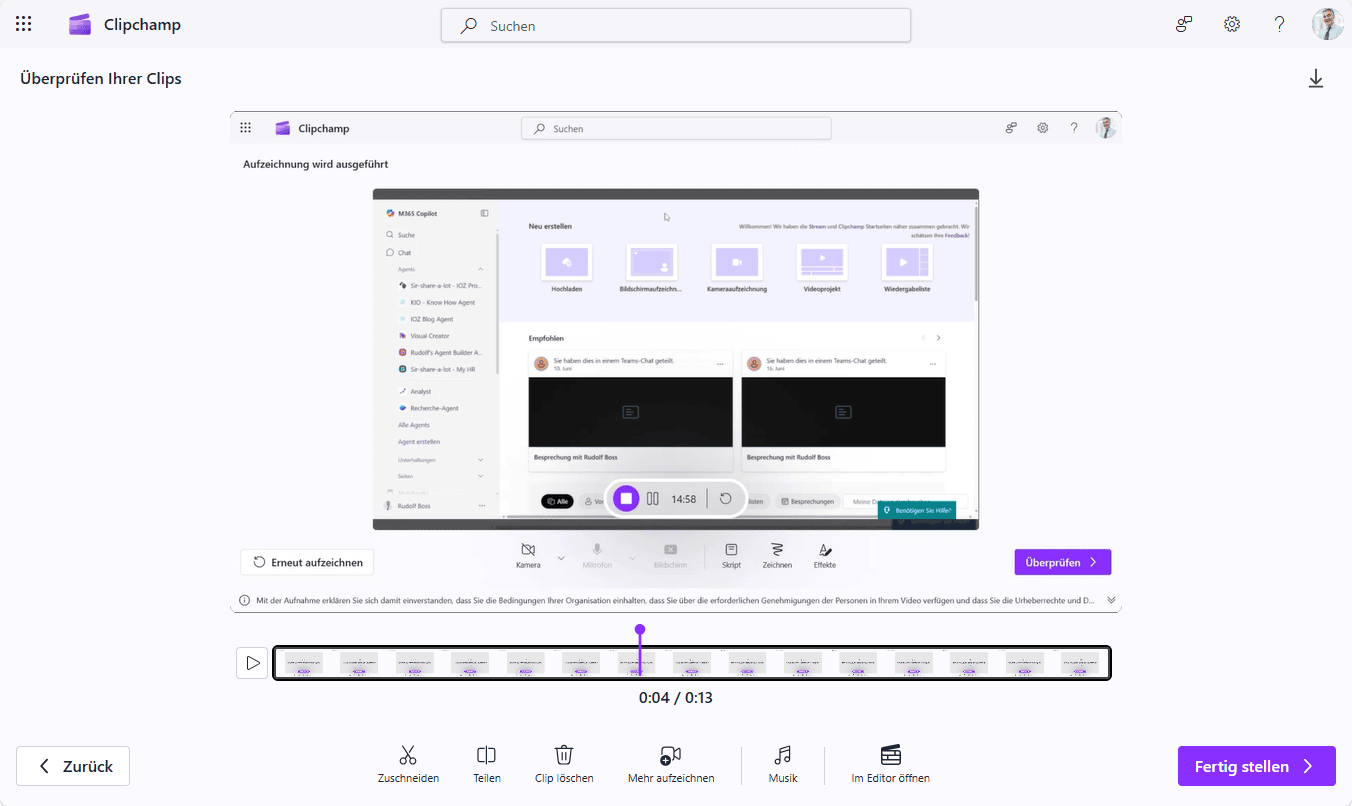 Mit der Funktion Bildschirmaufzeichnung kann ein Video erstellt werden, bei dem ein Browser-Tab oder der ganze Bildschirm aufgezeichnet werden kann. Dabei kann eine Videoanleitung erstellt werden, um Funktionen zu erklären. Dies kann mit eingeblendeter Video-Kamera des Referierenden wie auch mit oder ohne Ton aufgezeichnet werden. Wird die Bildschirmaufzeichnung gestoppt, lässt sich das Video bearbeiten. Es lassen sich beispielsweise der Start oder das Ende rausschneiden, oder man kann eine Hintergrund-Musik direkt in das Video einfügen. Mittels In Editor öffnen kann das Video direkt im Clipchamp-Videobearbeitungstool geöffnet und bearbeitet werden.