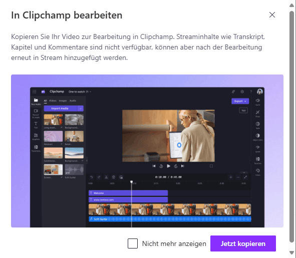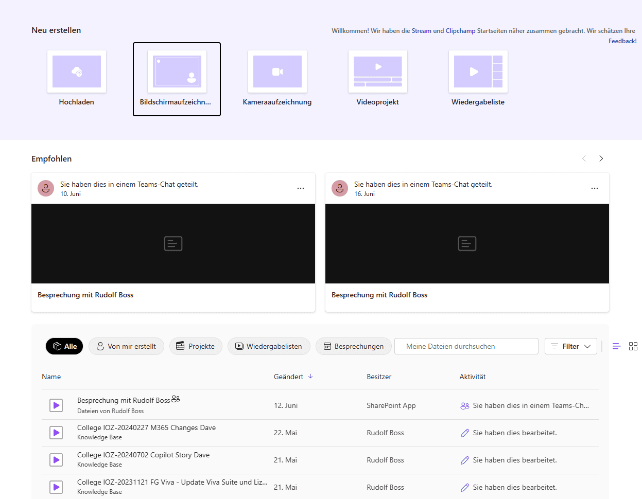 Das Videoportal Microsoft Stream wird zu Clipchamp re-branded. Clipchamp wurde bisher nur für die Bearbeitung der Videos verwendet und Microsoft Stream als Portal und Übersicht der vorhandenen Videos. Neu trägt beides den Namen Clipchamp und das Videoportal wie auch die online Videobearbeitung werden unter dem Namen Clipchamp geführt. Microsoft Stream als Name verschwindet nach und nach aus der M365-Welt.