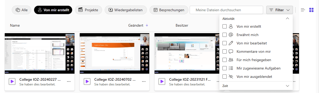 Im unteren Teil des Clipchamp Portals werden die vorhandenen Videos angezeigt, auf die der angemeldete User Zugriff hat. Dabei stehen verschiedene Standardansicht zur Verfügung, zwischen denen gewechselt werden kann. Zusätzlich stehen Filter zur Verfügung, oder die Ansicht lässt sich als Liste oder Raster anzeigen. Bei der Suche kann nach einem Titel eines Videos gesucht werden. In der Suche sind die Transkriptionen der Videos aktuell nicht enthalten.