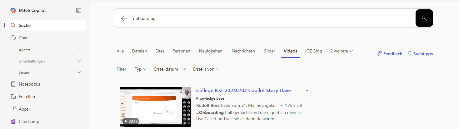 Um Begriffe zu suchen, die in Videos erwähnt und entsprechend transkribiert wurden, kann die Microsoft Search verwendet werden. Sucht man da nach einem Begriff und schränkt die Ergebnisse ein, findet man unmittelbar die Videos, bei denen der gesuchte Begriff vorkommt.