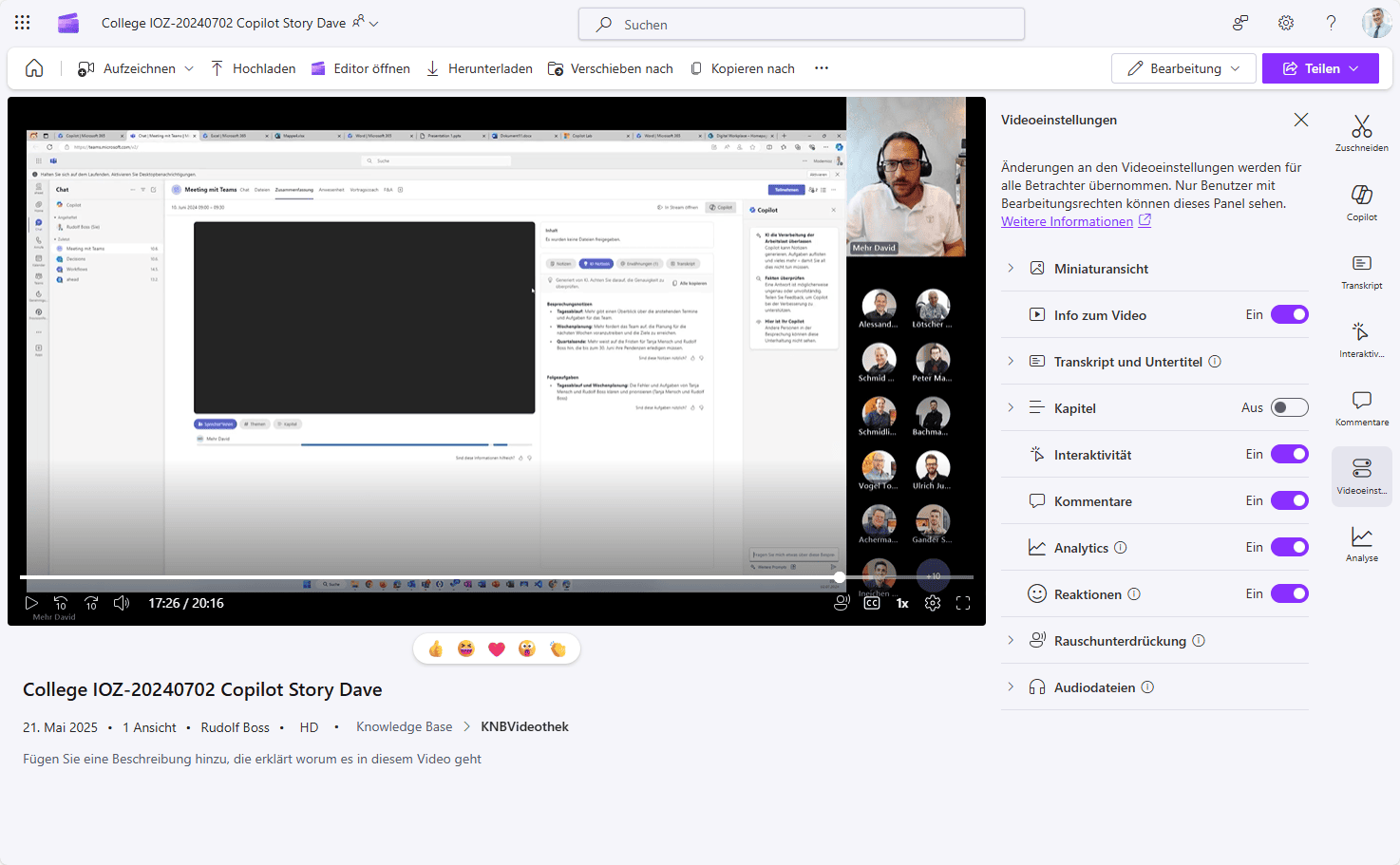 Bei aufgezeichneten und transkribierten Teams-Meetings wird das Transkript automatisch generiert. Falls andere eigene Videos erstellt und verwendet werden, kann das Transkript über die Einstellungen generiert werden. Dabei kann zurzeit allerdings nur die Sprache Deutsch (Deutschland), nicht aber Deutsch (Schweiz) gewählt werden, was komischerweise aber sehr gut klappt 😉.