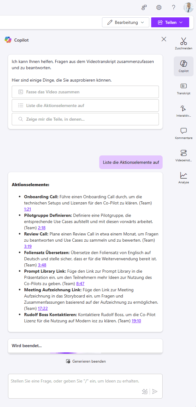 Sobald ein Transkript verfügbar ist, kann mittels Copilot Prompts nach Inhalten, Zusammenfassungen, Aktionen oder Aufgabe nachgeforscht werden. Vor allem das Zusammenfassen von Videos oder Meetings ist eine gute Möglichkeit der Effizienzsteigerung: Man hat den Kopf frei, um sich ganz dem Meeting zu widmen und nicht noch nebenbei Notizen machen zu müssen. Falls man unsicher ist, ob das Transkript korrekt erstellt wurde, hat man immer noch die Möglichkeit, das entsprechende Video manuell zu prüfen.