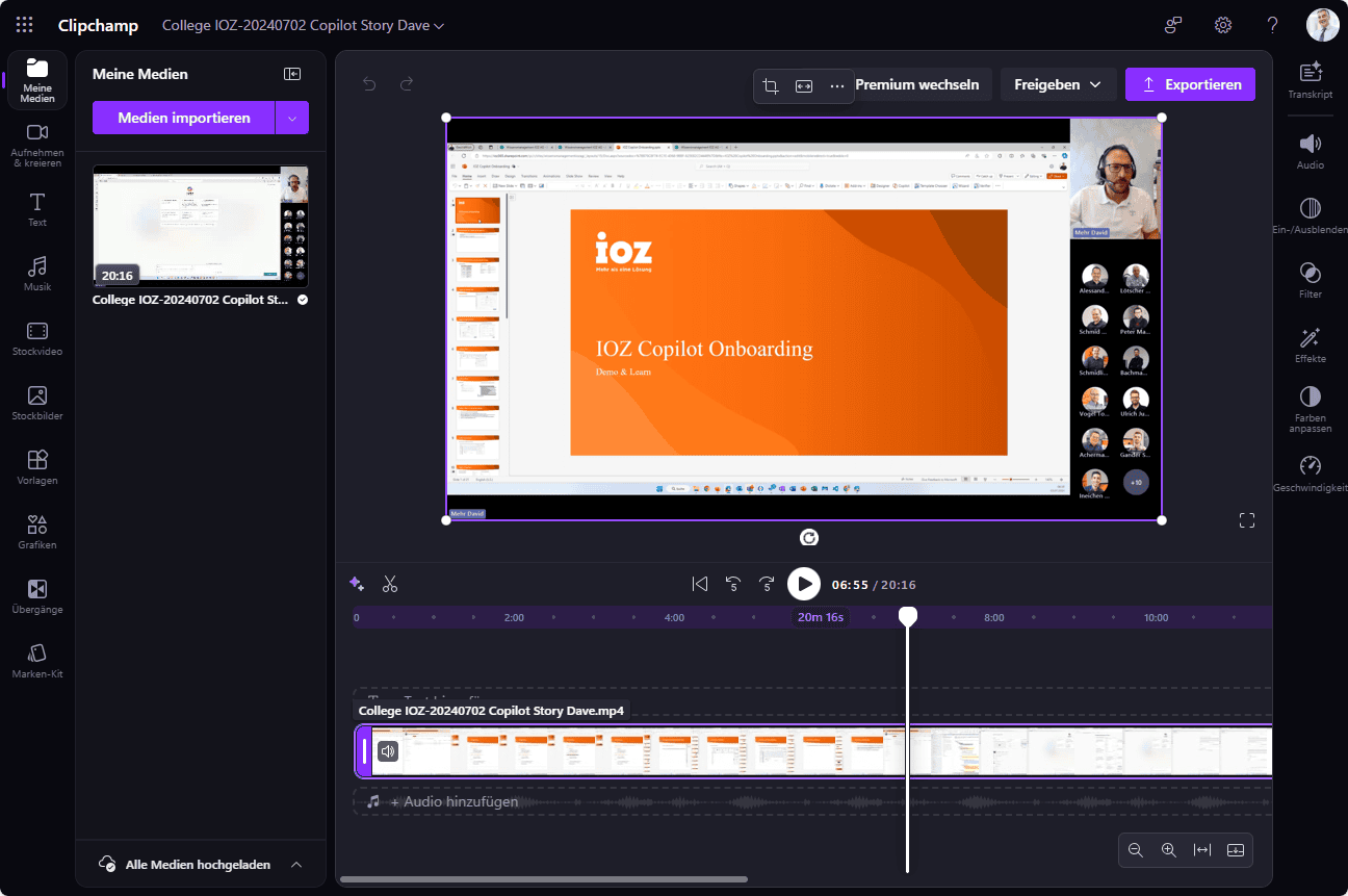 Die exportierte .mp4-Datei enthält danach alle Anpassungen, die am Video mit Clipchamp vorgenommen wurden. Also zusätzliche Video-Sequenzen, Übergänge, Hintergrund-Musik oder auch Call-to-Actions und das Audio, welches über die Text-to-Speech Funktionen eingefügt wurde.