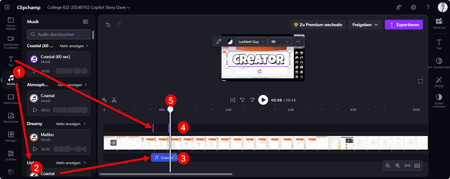 In der Bearbeitungsleiste (1) kann der gewünschte Typ, der eingefügt werden soll, ausgewählt werden. Es erscheint eine Auswahl (2) von Elementen, die nun verwendet werden können. Dabei kann das Element (2) einfach per Drag-and-Drop auf das Video „gezogen“ werden. Das Element erscheint dann in der Zeitachse zum eingefügten Zeitpunkt. Auf der Zeitachse sind dann die eingefügte Musik (3) die eingefügten Texte (4) ersichtlich. Mittels Schieb-Regler (5) kann innerhalb des Videos schnell und einfach zum gewünschten Zeitpunkt oder zum eingefügten Element gesprungen werden. Die eingefügten Elemente lassen sich ebenfalls mit Drag-and-Drop auf der Zeitachse ganz einfach verschieben.