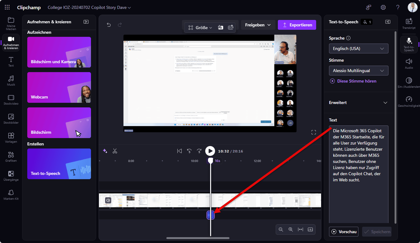 Meiner Ansicht nach ein Highlight von Clipchamp ist die Text-to-Speech Funktion. Mittels der Text-to-Speech Funktion kann der Text, der gesprochen werden soll, eingegeben werden und mittels einer ausgewählten Computer-Stimme wiedergegeben werden. Dabei kann auf eine Vielzahl von Beispiel-Stimmen zurückgegriffen werden. Zudem ist es möglich, die Wiedergabe des Textes in einer anderen Sprache vorzunehmen, um so das Video mehrsprachig wiederzugeben. Dies ermöglicht es, Videos einmalig aufzunehmen und für verschiedene Sprachen wieder zu verwenden. Der eingefügte Text erscheint dann ebenfalls auf der Zeitachse, kann verschoben und wieder bearbeitet und ergänzt werden.
