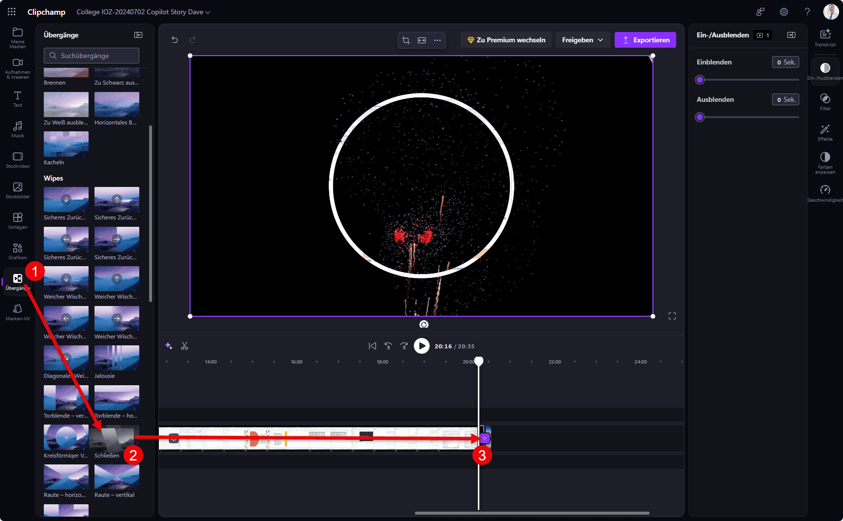 Mit Clipchamp können mehrere Videos eingefügt werden, so können verschiedene Videosequenzen aneinandergereiht werden. Die einzelnen Videos können am Anfang oder Ende der Zeitachse mit Drag-and-Drop eingefügt werden. Um die Videos nahtlos aneinanderzufügen, können Übergänge zwischen den einzelnen Videos eingefügt werden. Über die Bearbeitungsleiste (1) kann ein verfügbarer Übergang (2) per Drag-and-Drop auf die Zeitachse (3) gezogen werden. Der Übergang wird dann entsprechend beim Abspielen der Videos automatisch angewendet.