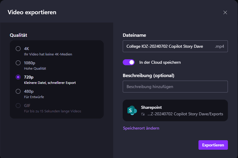 Sobald die Bearbeitung des Videos abgeschlossen ist, kann das .clipchamp-Video über die Exportieren-Funktion oben rechts als .mp4-Datei exportiert und bereitgestellt werden. Beim Export kann die Qualität des Videos mitgegeben werden.