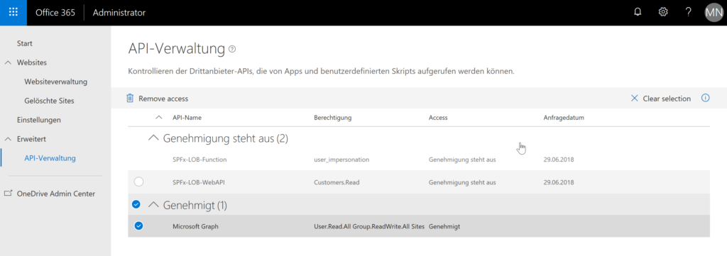 Auf dieser Übersicht sehen Sie den API-Namen, die Berechtigung, den Zugriff auf Daten (Access) sowie das Anfragedatum. Auf dem Screenshot sehen Sie, dass im Admin Center noch Genehmigungen ausstehend sind und eine Aktion erfordern. Unten wird aufgeführt, welche Anfragen bereits genehmigt sind. Diese können jederzeit wieder entfernt werden.