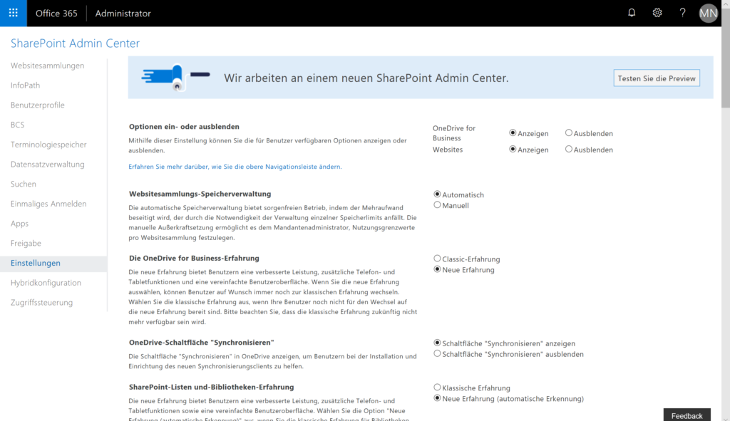 Die neue SharePoint Online Admin Center Erfahrung steht seit Februar 2018 als Preview für Target Release Kunden und für den Standard Release seit Ende März zur Verfügung. Seither wurden regelmässig neue Funktionen ausgerollt. Da die neue Erfahrung noch nicht offiziell verfügbar ist, können Sie wie gewohnt die klassische Erfahrung nutzen. Sie sehen in der oberen Hälfte des SharePoint Admin Centers eine Schaltfläche mit der neuen Erfahrung.
