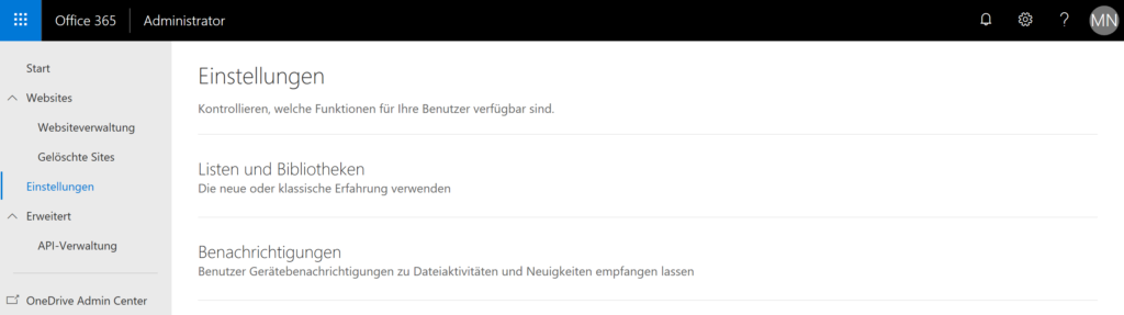 Auf den ersten Blick fällt auf, dass die linke Navigation kaum Menüpunkte aufweist. Beim alten Admin Center sind es mehr als 10 Menüpunkte. Zudem sind neue Untermenüpunkte vorhanden, wie z.B. Websites oder erweiterte Einstellungen.