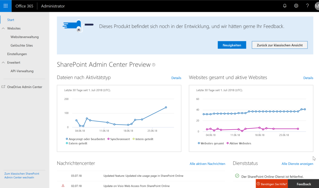 Wenn wir beide Admin Center betrachten, sehen wir, dass die Startseite bei der neuen Erfahrung Dashboards anstatt einer Auflistung aller Websitesammlungen anzeigt. Es werden einerseits die Aktivitäten von Dateien aufgezeigt, andererseits ist auch die Verwendung der SharePoint Seiten ersichtlich. Bei Klick auf Details wechselt man zur Detail-Ansicht ins Microsoft 365 Admin Center. Im unteren Bereich befindet sich das Nachrichtencenter mit den aktuellen Informationen sowie der Dienststatus.