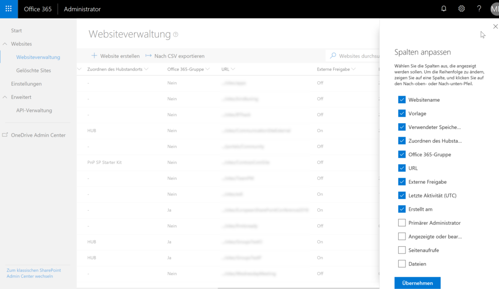 Die Spalteninformationen sind sehr wertvoll, da es im alten Admin Center keine Möglichkeit gab, moderne SharePoint Site Collections (Teamsite oder Communcation Site) aufzulisten.