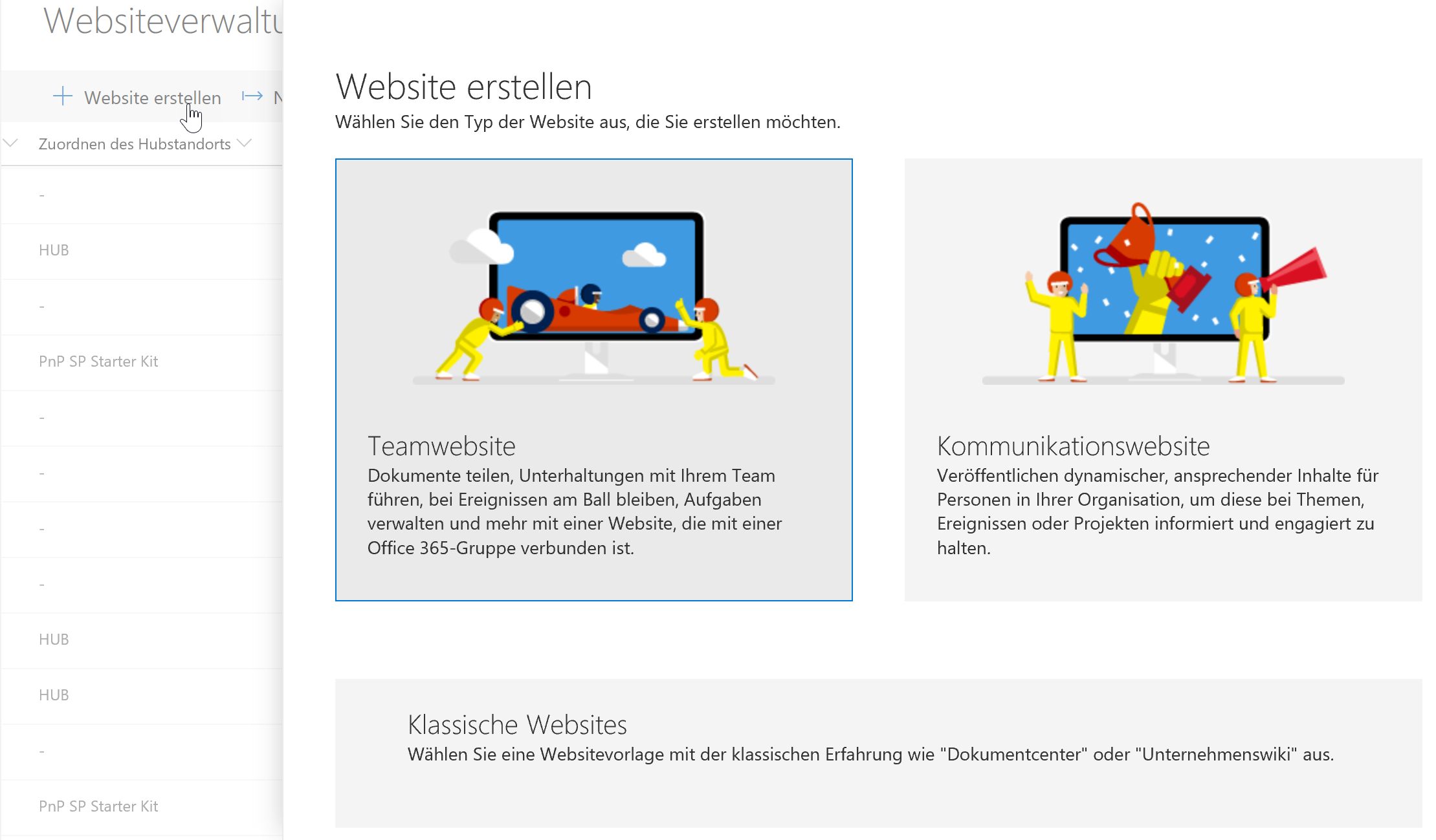 In der Websiteverwaltung findet man eine Übersicht aller Site Collections auf dem Tenant. Hier hat man auch die Möglichkeit, eine neue Site Collection zu erstellen. Ähnlich wie bei SharePoint Home können hier moderne Teamsites oder Communication Sites erstellt werden. Zudem besteht (noch) die Möglichkeit, klassische Site Collections zu erstellen.