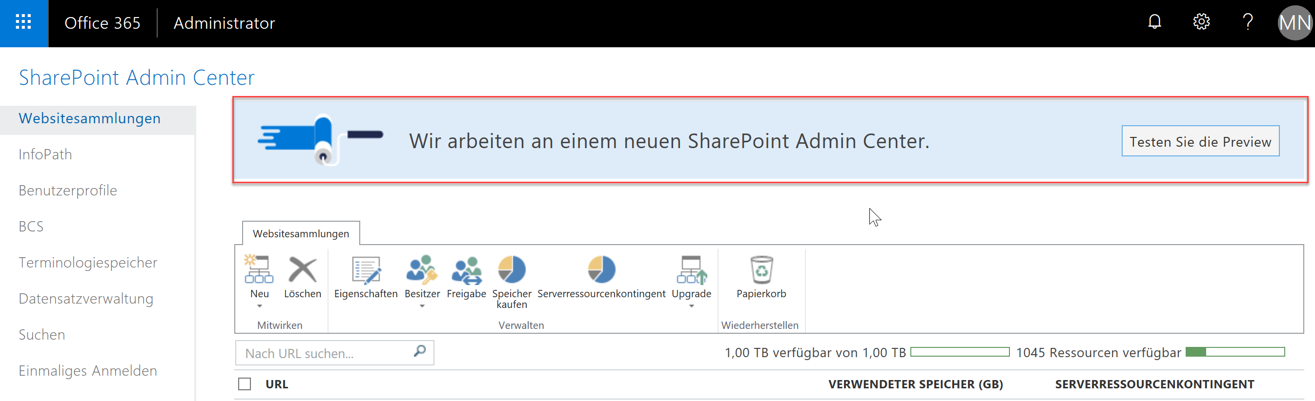 Die neue SharePoint Online Admin Center Erfahrung steht seit Februar 2018 als Preview für Target Release Kunden und für den Standard Release seit Ende März zur Verfügung. Seither wurden regelmässig neue Funktionen ausgerollt. Da die neue Erfahrung noch nicht offiziell verfügbar ist, können Sie wie gewohnt die klassische Erfahrung nutzen. Sie sehen in der oberen Hälfte des SharePoint Admin Centers eine Schaltfläche mit der neuen Erfahrung.