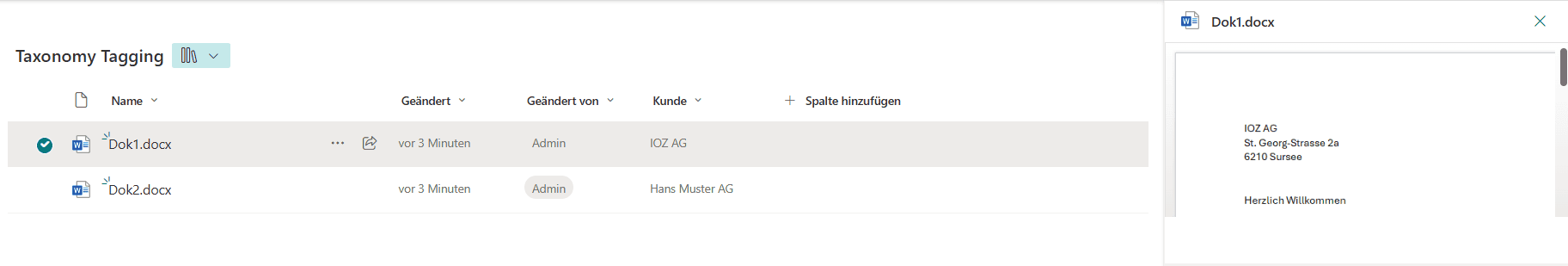 Wird nun ein entsprechendes Dokument, welches einen oder mehrere der Werte, welche im Term Store zur Verfügung stehend beinhaltet, werden diese als Metadaten in die Spalte geschrieben.