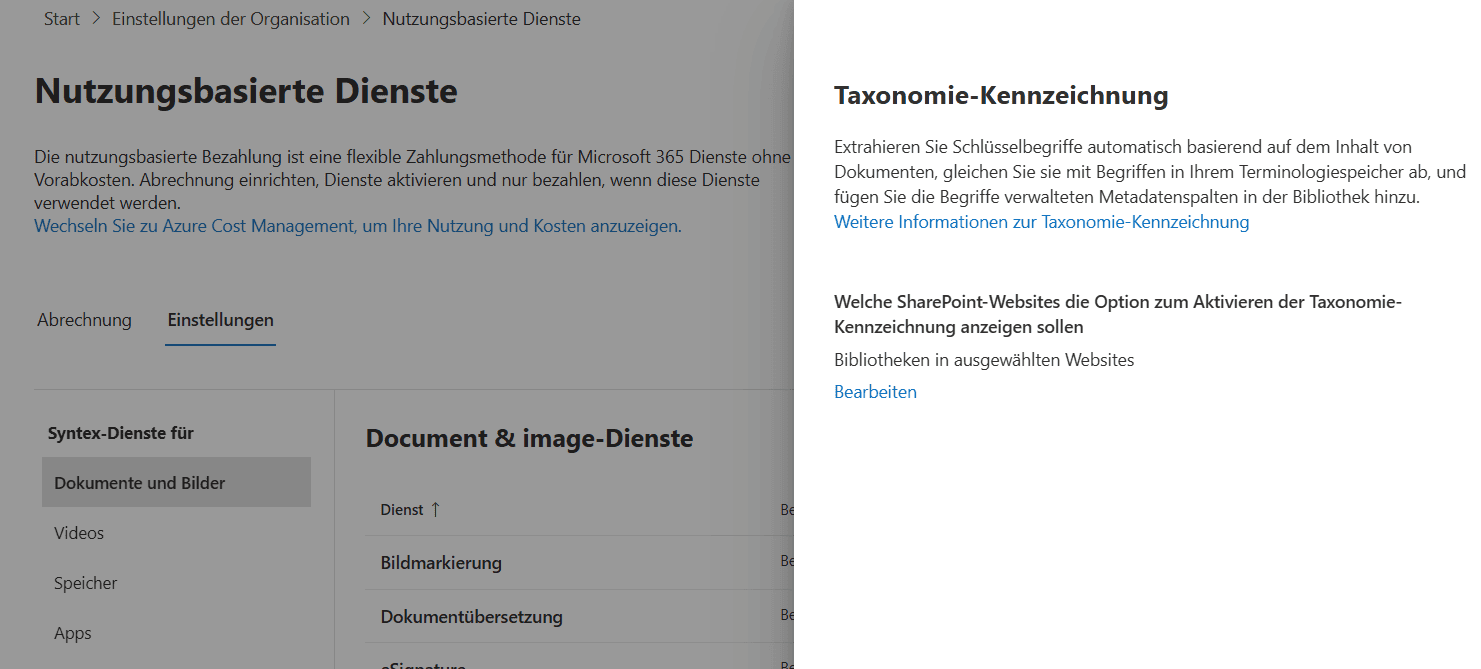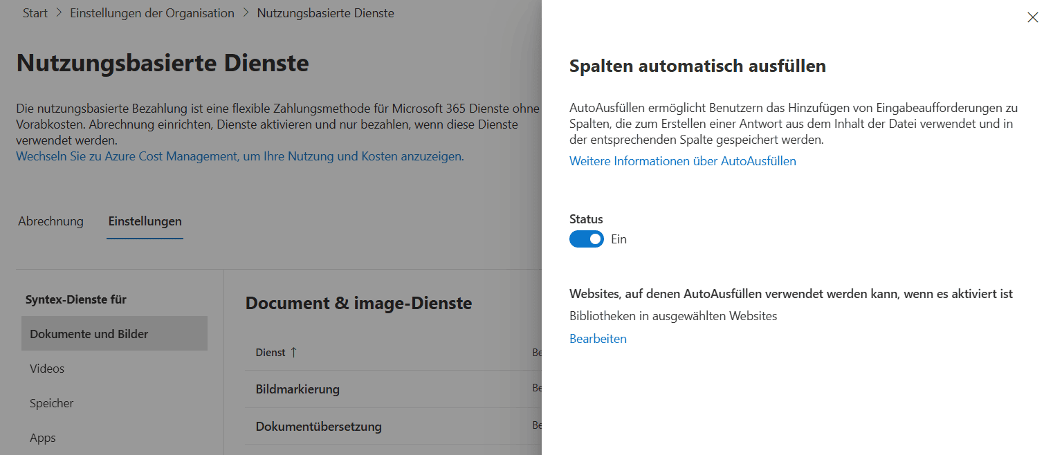 Wie auch Taxonomy Tagging setzt Autofill (Spalten automatisch ausfüllen) eine nutzungsbasierte Azure Subscription voraus und kann im Microsoft 365 Admin Center aktiviert werden.