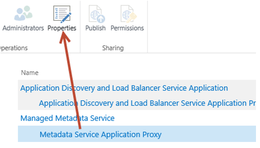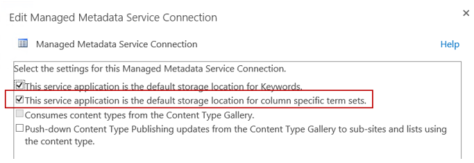 Um die Auswahl zu aktiveren, muss man in die Properties das „Metadata Service Application Proxy“ in den „Service Applications“ aufrufen. Danach muss die Option „This service application is the default storage location for column specific term sets“ aktiviert werden: