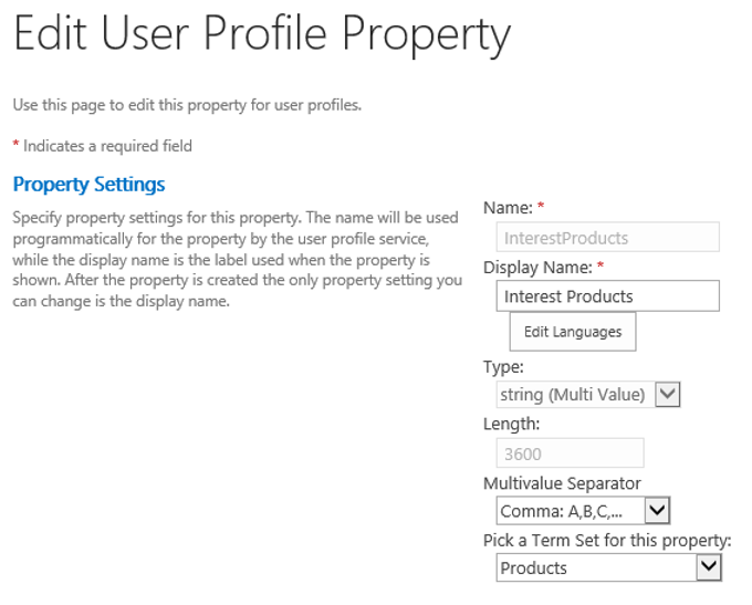 Anschliessend kann in einem neuen oder in einem bereits vorhandenen User Property das Term Set ausgewählt werden. Dazu müssen Sie die User Profile Properties öffnen und folgende Konfiguration vornehmen: