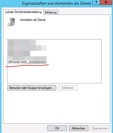 Der Dienst „Microsoft Azure AD Sync“ wird mit einem, durch die Installationsroutine automatisch erstellten, Benutzer im Format „AAD_123456789ABCDE“ gestartet. Wird nun die lokale Gruppenrichtlinie „Anmelden als Dienst“ oder auf Englisch „Logon as a Service“ per Group Policy übersteuert, muss der besagte Benutzer zwingend berechtigt werden:
