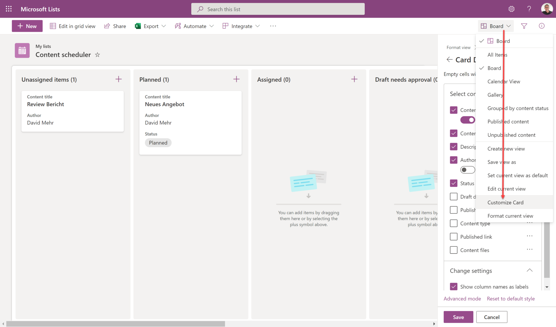 Listenelemente in der Board-Ansicht verwalten