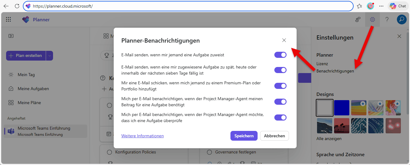 Microsoft Planner spezifische Einstellungen für Benachrichtigungen können direkt in der Planner App https://planner.cloud.microsoft/ vorgenommen werden. Dabei können verschiedene Einstellungen zu E-Mail Benachrichtigungen vorgenommen werden.