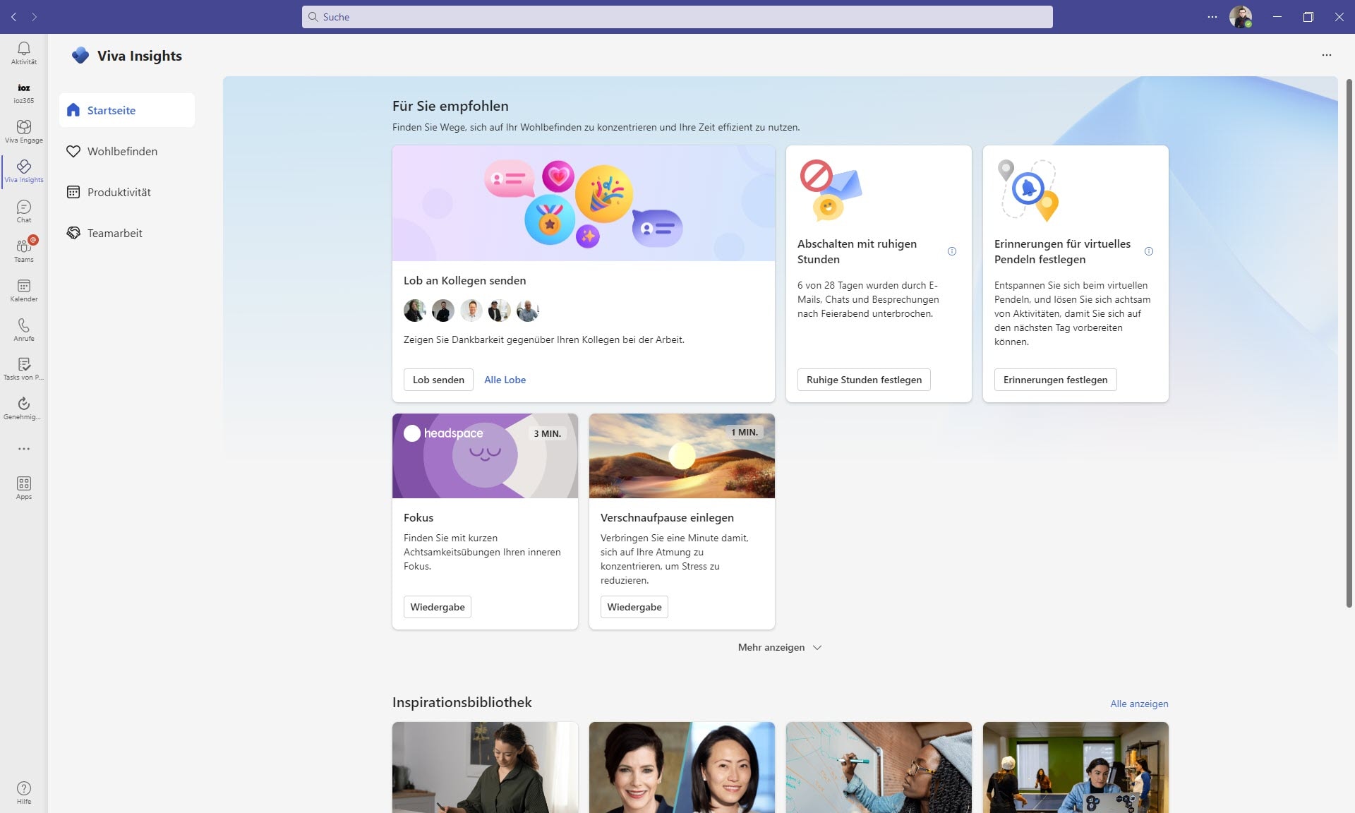 Die Startseite von Microsoft Viva Insights in Microsoft Teams eingebunden