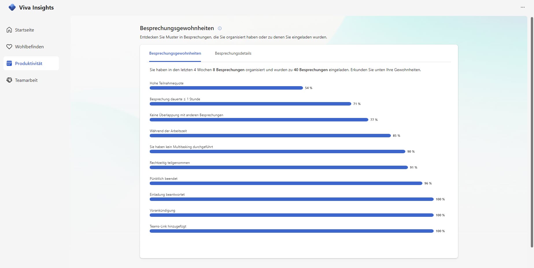Im Tab «Produktivität» weist Microsoft Viva Insights eine Auswertung des eigenen Besprechungsverhaltens der letzten 4 Wochen aus. Diese bietet Einblicke in: