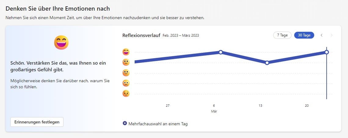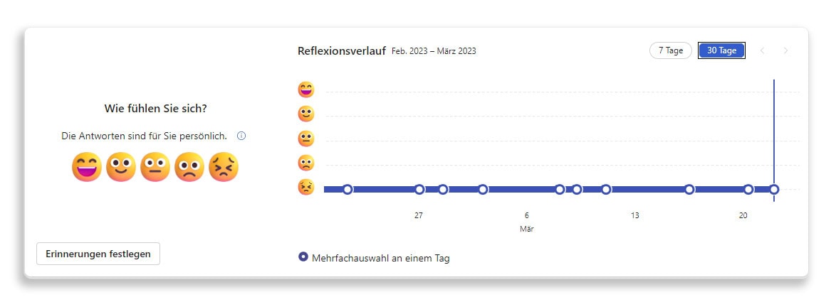 Mittels 5 Emojis kann in Viva Insights die eigene Stimmung festgehalten werden. Fühle ich mich super, klicke ich auf das Smiley-Emoji. Fühle ich mich nicht so gut, wähle ich eines der traurigen Emojis aus. Über die Tage und Wochen hinweg entsteht ein Stimmungsverlauf, welcher in einer visualisierten Grafik eingesehen werden kann.