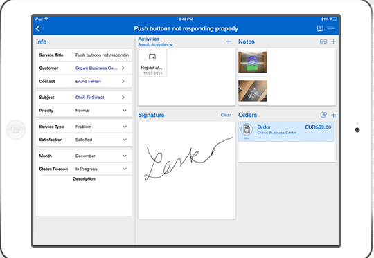 Ist beispielsweise bei einem Kunden eine Maschine defekt, kann diese Maschine über das Tablet im CRM gesucht werden. Ist das Problem identifiziert, kann der Mitarbeiter den entsprechenden Reparaturprozess laden und wird durch die Reparatur geleitet. Alle Erkenntnisse werden in der Resco App notiert, so kann ein anderer Mitarbeiter bei einem zukünftigen Problem die notwendigen Informationen schnell finden. Der Bestand der Ersatzteile kann einfach über die Resco App nachgeschaut werden und bei Bedarf kann der Bestellprozess gestartet werden.