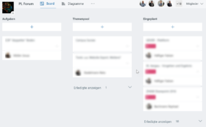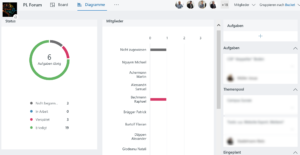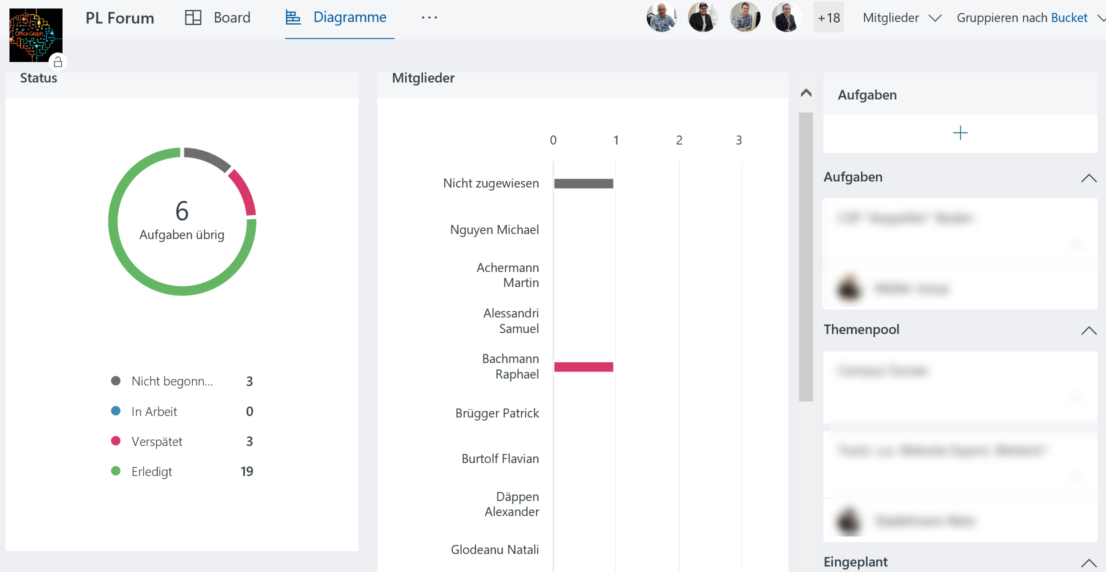 Planner bietet verschiedene Ansichten, um die Aufgaben darzustellen. Die Board-Ansicht zeigt den Plan mit den Buckets und deren zugewiesenen Aufgaben an. Die Diagramm-Ansicht zeigt den Status der Aufgaben, die Mitglieder mit den zugewiesenen Tasks und die Aufgaben als Karten. Mit dieser Ansicht sieht man sofort, welche Teammitglieder ausgelastet sind und welche noch Ressourcen haben. Dadurch können dringende Aufgaben priorisiert werden.