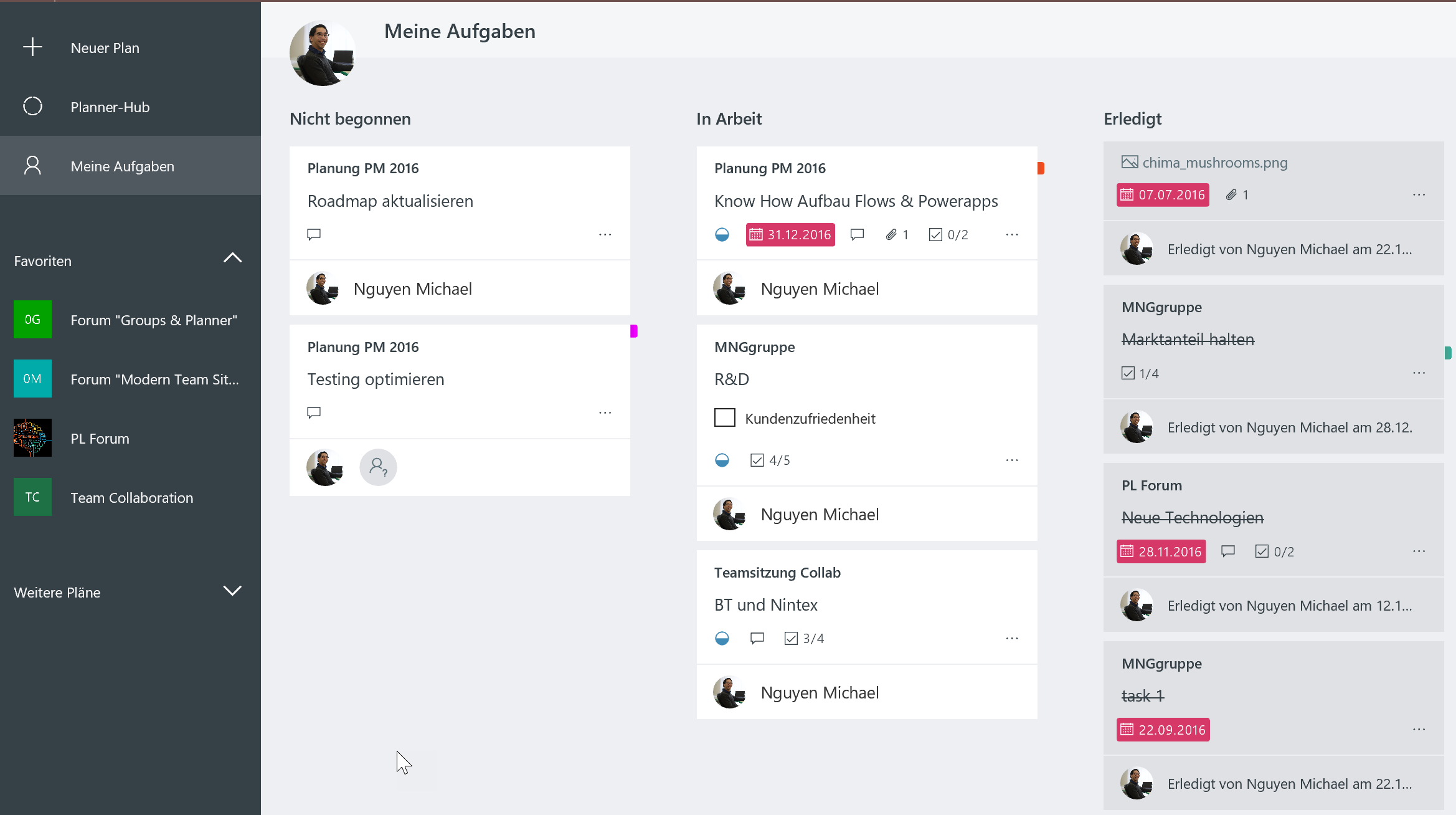 Natürlich! Da Planner Bestandteil von Office 365 Groups ist, sind alle Groups-Funktionalitäten vorhanden. Wenn in den Groups-Konversationen über eine Aufgabe diskutiert wird, erscheinen die Kommentare im Planner bei den Aufgabenkarten. Werden in den Konversationen Attachments angehängt, landen diese in der SharePoint-Dokumentenablage. In den Planner-Aufgaben können auch Attachments hochgeladen werden, welche dann als Vorschau angezeigt werden. Diese liegen ebenfalls in SharePoint.