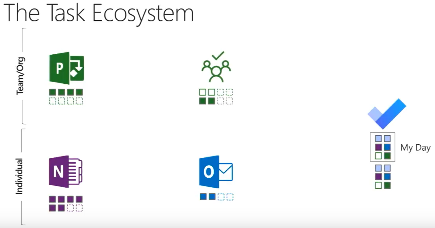 Microsoft veröffentlichte Mitte 2017 eine neue Task-Management App namens To-Do. To-Do kann als mobile App oder auf dem Web verwendet werden und ist der Nachfolger von Wunderlist. Diese App wird wohl zukünftig das Microsoft-Task-Problem lösen, indem sie alle Aufgaben von verschiedenen Quellen in einer Ansicht auflistet. To-Do kann bereits alle Outlook-Aufgaben synchronisieren. Später wird es eine Integration zu Planner geben, so dass auch die Planner-Aufgaben in To-Do aufgelistet werden.