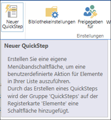 Im Ribbon innerhalb des Registers Bibliothek (bei Listen entsprechend in der Register-Liste) auf „Neuer QuickStep“ klicken.