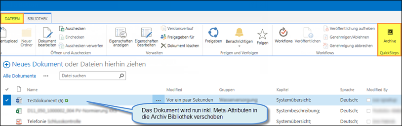 Wir möchten Dokumente archivieren und diese dann in eine andere Bibliothek verschieben. Die Meta-Attribute sollen dabei komplett übernommen werden. In der öffentlichen Bibliothek hatten viele Mitarbeitende Schreibrechte. In der Archiv Bibliothek dürfen Dokumente jedoch nicht mehr verändert werden. Das bedeutet, dass die Bearbeitungsrechte entzogen werden müssen.