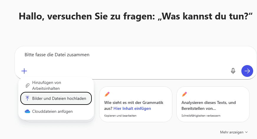 Der Copilot Chat kann durch alle User genutzt werden, auch ohne M365 Copilot Lizenz. Mit Copilot Chat können Abfrage aus öffentlich verfügbaren Informationen vorgenommen werden und liefert Ergebnisse vom Web. Im Copilot Chat können aber auch Dateien hochgeladen und abgefragt oder zusammengefasst werden. Die durch den User hochgeladenen Datei werden im OneDrive des Users gespeichert, so bleiben die Dateien in M365, sind nur für den User zugreifbar und landen nicht im Web oder können durch nicht berechtigte User aufgerufen werden.