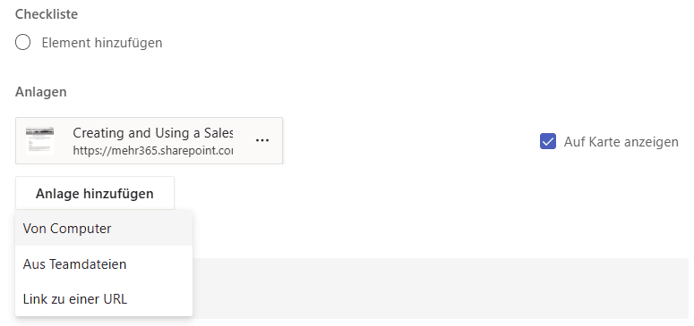 Planner, das Task Management für Teams im Microsoft Teams, nutzt ebenfalls SharePoint als Dateiablage. Wird in einem Planner Task eines Teams ein Anhang vom Computer hochgeladen und hinzugefügt, wird dieser Anhang automatisch in der SharePoint Bibliothek auf dem Teams abgelegt.