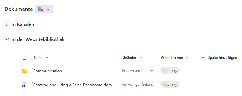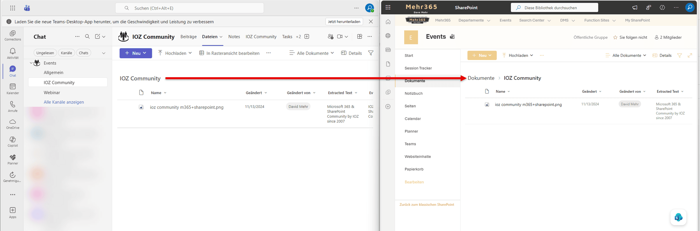 Beim Erstellen eines Microsoft Teams wird immer automatisch eine SharePoint Site zur Ablage der Dokumente angelegt. Die Dateien, die in einem Teams abgelegt werden, werden in der SharePoint Standard Bibliothek abgespeichert. So können die Dokumenten Management Funktionen, welche SharePoint bietet, auch in Teams genutzt werden. Pro angelegtem Kanal in Teams wird ein entsprechender Ordner in der SharePoint Bibliothek angelegt.