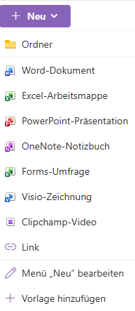 Eine Blick in das „Neu“-Menü der SharePoint Bibliothek zeigt, welche Dateien direkt in SharePoint angelegt und gespeichert werden können. Diese Dateien werden direkt in der Bibliothek resp. im gewählten Ordner angelegt. Ausser die Forms-Umfrage: Die kann zwar über SharePoint angelegt werden, wird aber auf dem dedizierten Forms-Service gespeichert und nicht in SharePoint.