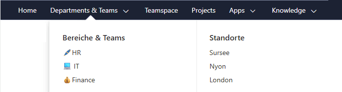 Die Site-Strukturen sind in M365 flach, d. h. ohne Hierarchien. Über die Navigation können die Sites jedoch logisch so angeordnet werden, dass die darin enthaltenen Informationen für den User verständlich bereitgestellt werden können. Dabei soll für User durch einen kurzen Blick auf die Navigation klar sein, welche Informationen wo abgerufen werden können. Da die Sites alle flach in M365 angelegt werden, können sie nach Belieben in der Navigation eingefügt und auch wieder geändert werden. Anbei das Beispiel einer möglichen Navigation: