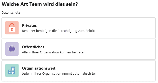 Beim Erstellen von Teams kann zwischen folgenden Arten gewählt werden: