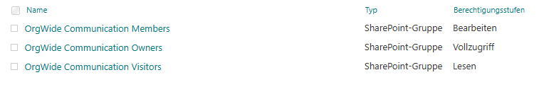 Schaut man sich die SharePoint Berechtigungen an, sieht man, welche Berechtigungs-Stufen auf SharePoint verwendet werden. Die entsprechenden SharePoint Gruppen werden automatisch angelegt. Die Besucher-Gruppen (Visitors) wird für das öffentliche Teams verwendet.