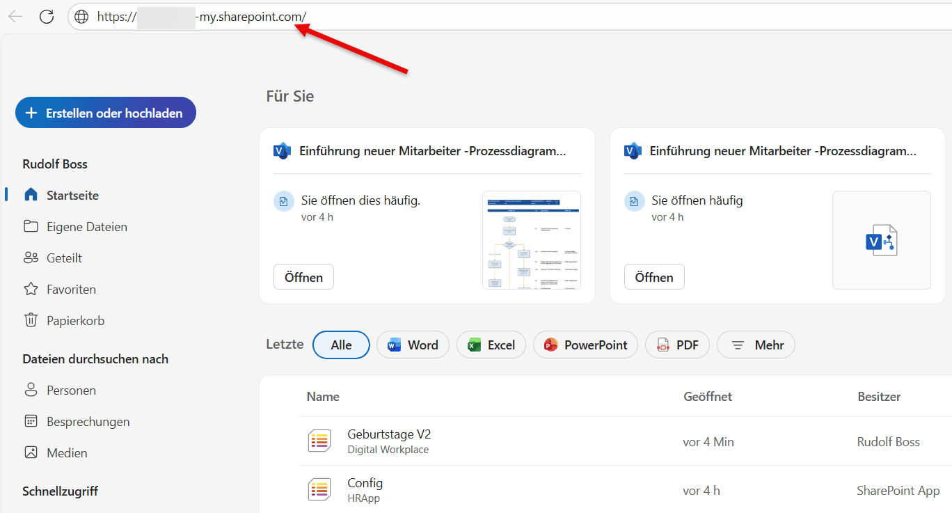 Die persönliche Ablage OneDrive liegt seit jeher ebenfalls auf SharePoint. OneDrive wird quasi als persönliches „Laufwerk“ in M365 für jeden User bereitgestellt und dient zur Ablage „meiner“ Dateien. Nebst der persönlichen Ablage wurde OneDrive in den letzten Jahren als persönliches Portal ausgebaut und bietet auf der Startseite zuletzt verwendete Dokumente und Inhalte. OneDrive verfügt über verschiedene persönliche Ansichten wie Geteilt, Favoriten oder auch Personen, Besprechungen oder Medien.