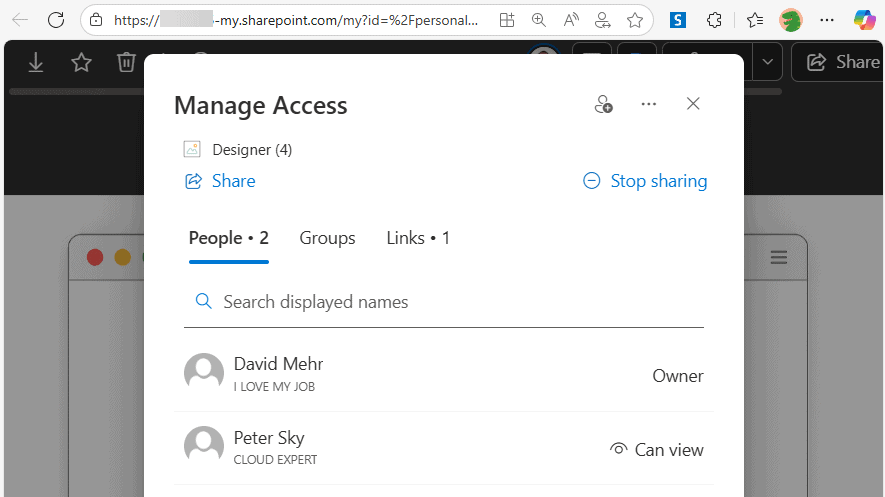 Die SharePoint-Ablage wird noch für weitere Funktionen in Microsoft Teams verwendet, genauer gesagt, OneDrive. Dateien, die in einem 1:1 Chat versendet werden, müssen an einem Ort abgelegt werden, an dem nicht alle User Zugriff haben, da es sich um persönliche oder vertrauliche Informationen handeln kann. Die Datei wird automatisch im OneDrive des Users (David Mehr – Owner) abgelegt, welcher die Datei versendet und automatisch mit dem Empfänger (Peter Sky – Can view) teilt. Somit wird sichergestellt, dass nur die beiden User aus dem 1:1 Chat Zugriff auf die Datei erhalten.