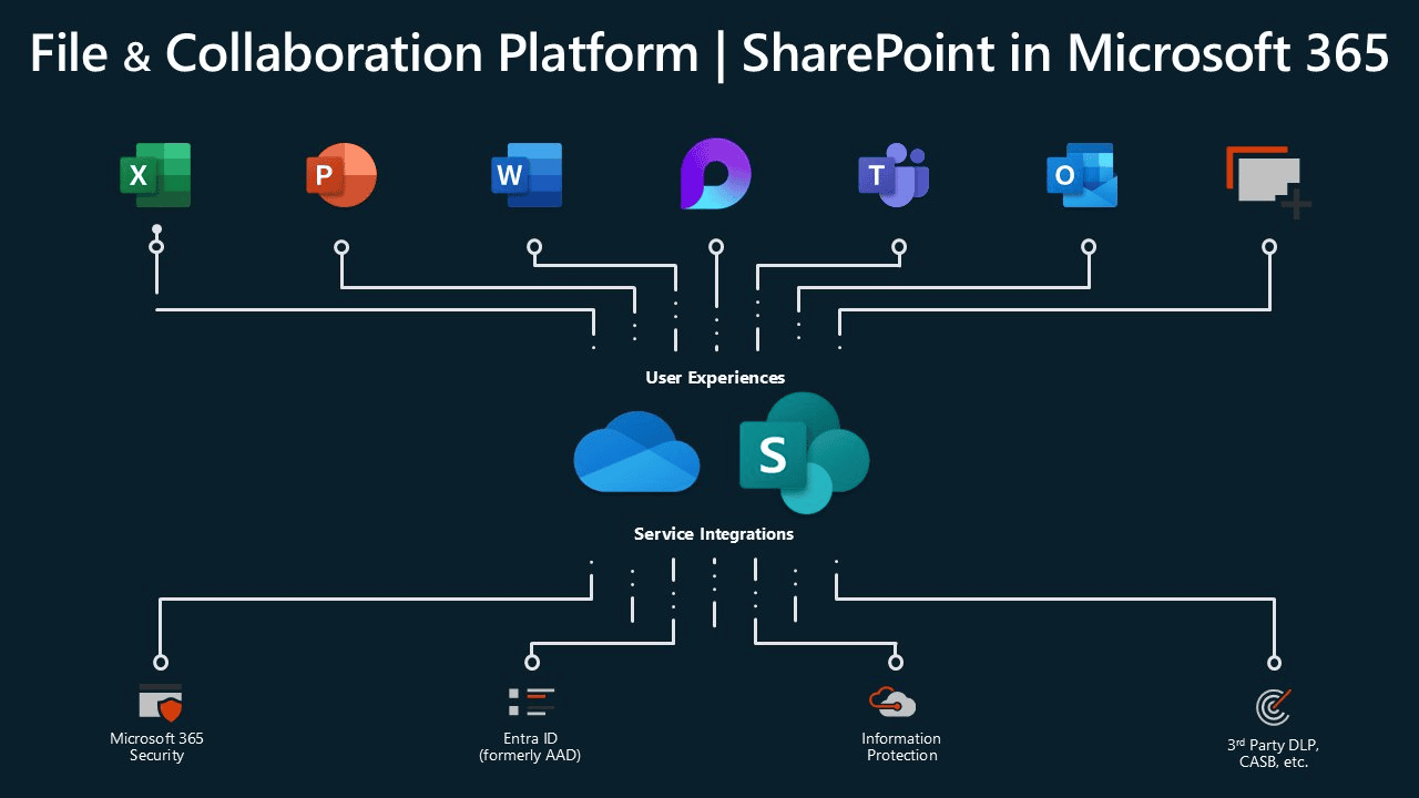 Dadurch, dass die Daten zentral auf SharePoint in M365 abgelegt werden, sind andere M365 Services integriert u.a. Entra ID für das Benutzer- und Gruppenmanagement sowie die Multifactor-Authentifizierung (MFA) oder Microsoft Purview für den erweiterten Schutz der abgelegten Daten.