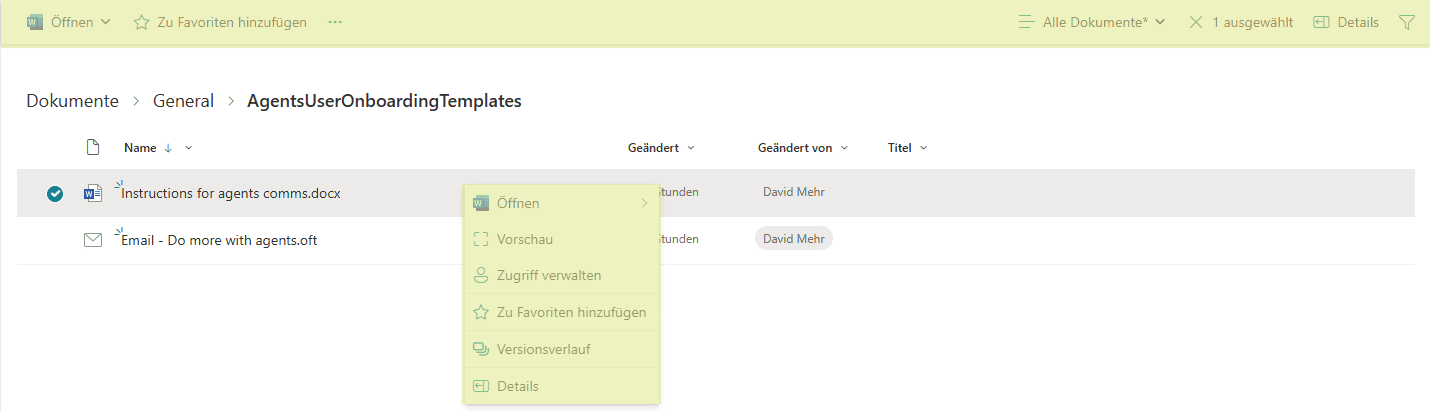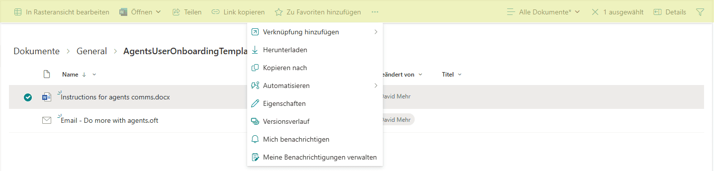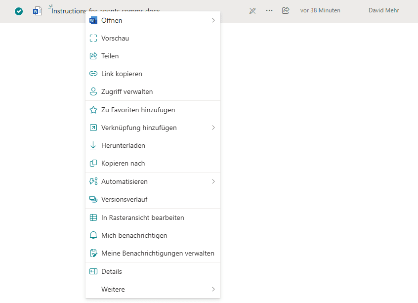 Als Kontextmenü in SharePoint wird das Menü bezeichnet, welches erscheint, wenn entweder ein Rechtsklick auf ein Element gemacht wird oder die 3 Pünktchen … , rechts neben dem Titel, geklickt werden.