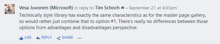 Seine Antwort auf die Frage, was denn nun der genaue Unterschied zwischen Style Library und der Master Page Gallery sei, ist ebenfalls sehr spannend: