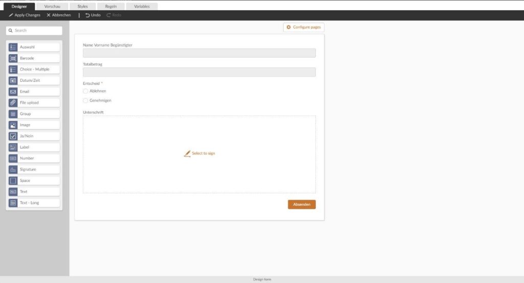 Neben den verschiedenen Konfigurationsmöglichkeiten, welche auch vom On-Prem- resp. O365-Produkt bekannt sind, sticht neuerdings die Schaltfläche «Design form» ins Auge. Wählt man dieses an, öffnet sich der Formular-Editor und das Aufgabenformular kann bearbeitet werden.