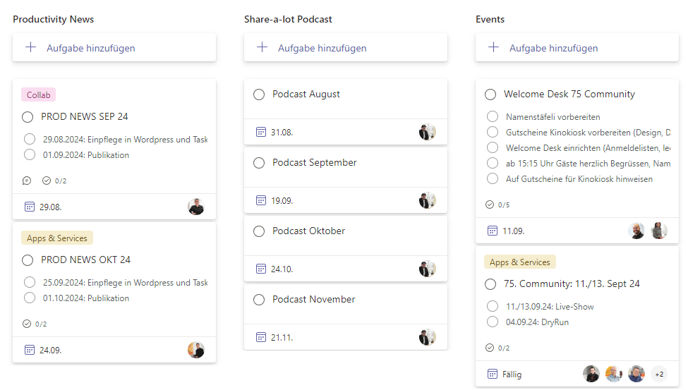 Die Aufgaben werden in Planner erstellt und verwaltet, das heisst mit Titel, sinnvoller Beschreibung, Links, und noch viel wichtiger, mit Zuständigkeit und Termin.